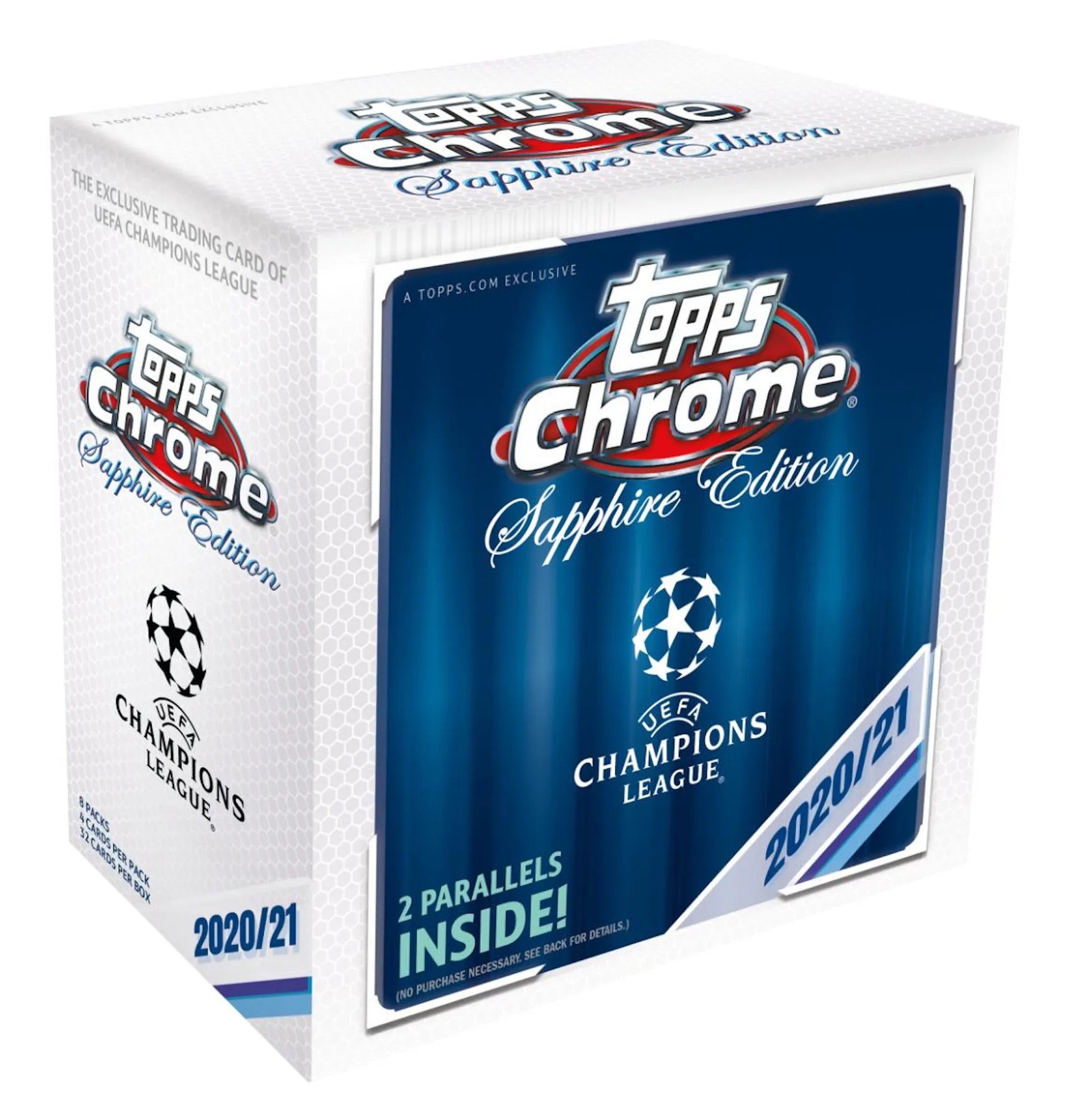 Topps Chrome Sapphire features a 100-card base set. The box-hit parallels can come from the base set or Future Stars insert. Find 2 parallels inside! 8 packs per box.4 cards per pack.