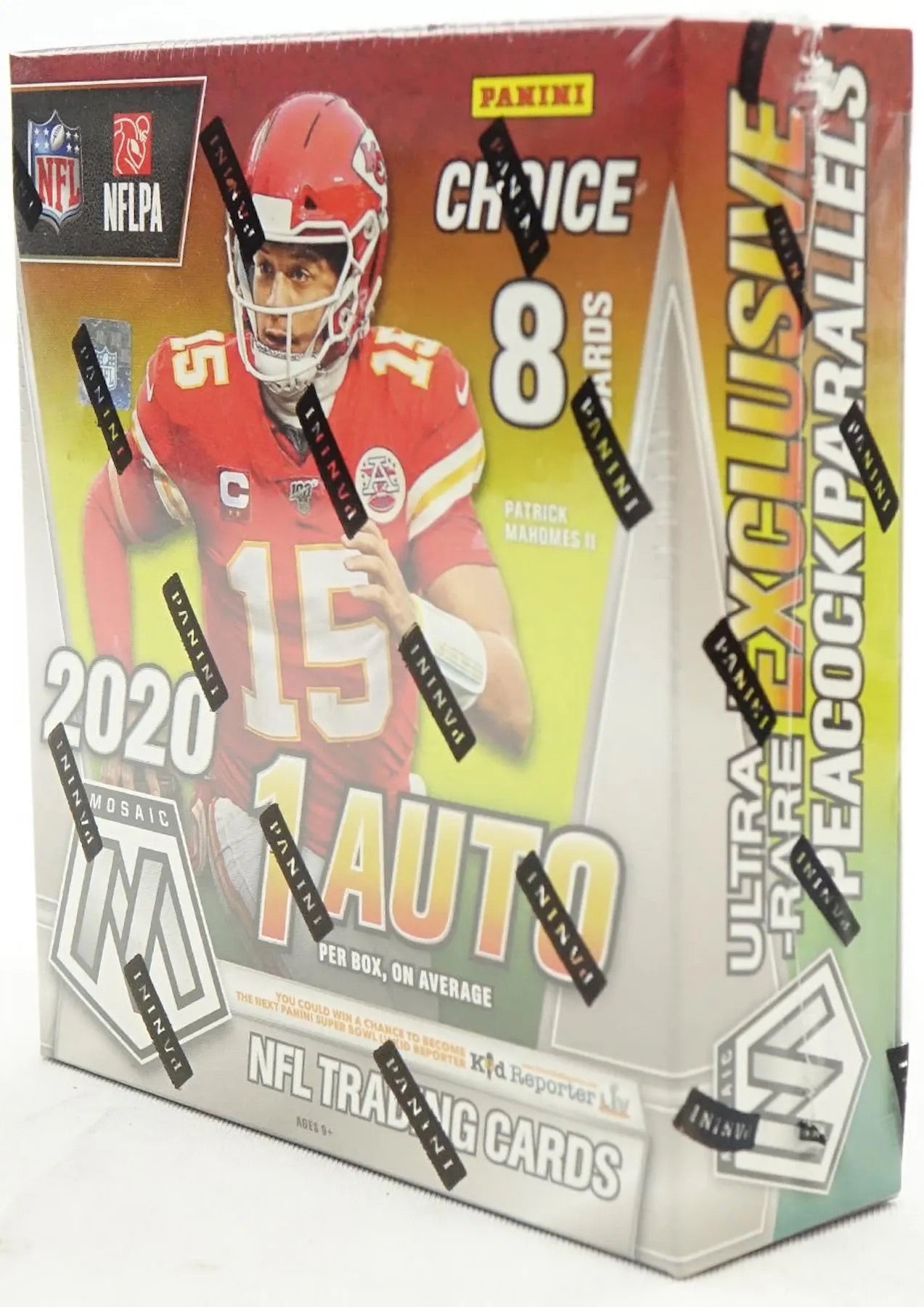 Exclusive to Hobby Choice find the super short printed Peacock parallel! Look for the following parallels of the Base and Rookies only found in Hobby Choice boxes, Red and Green, Fusion Red (#’d /78), Black Gold (#’d /8) and Nebula (#’d 1/1). Chase all the hottest new rookies including Joe Burrow, Chase Young, Tua Tagovailoa, D’Andre Swift and many more! 8 cards per pack. 1 pack per box. Find 1 autograph, 1 silver parallel, 1 mosaic parallel, 2 choice rookies and 3 exclusive mosaic parallels per box on average!
