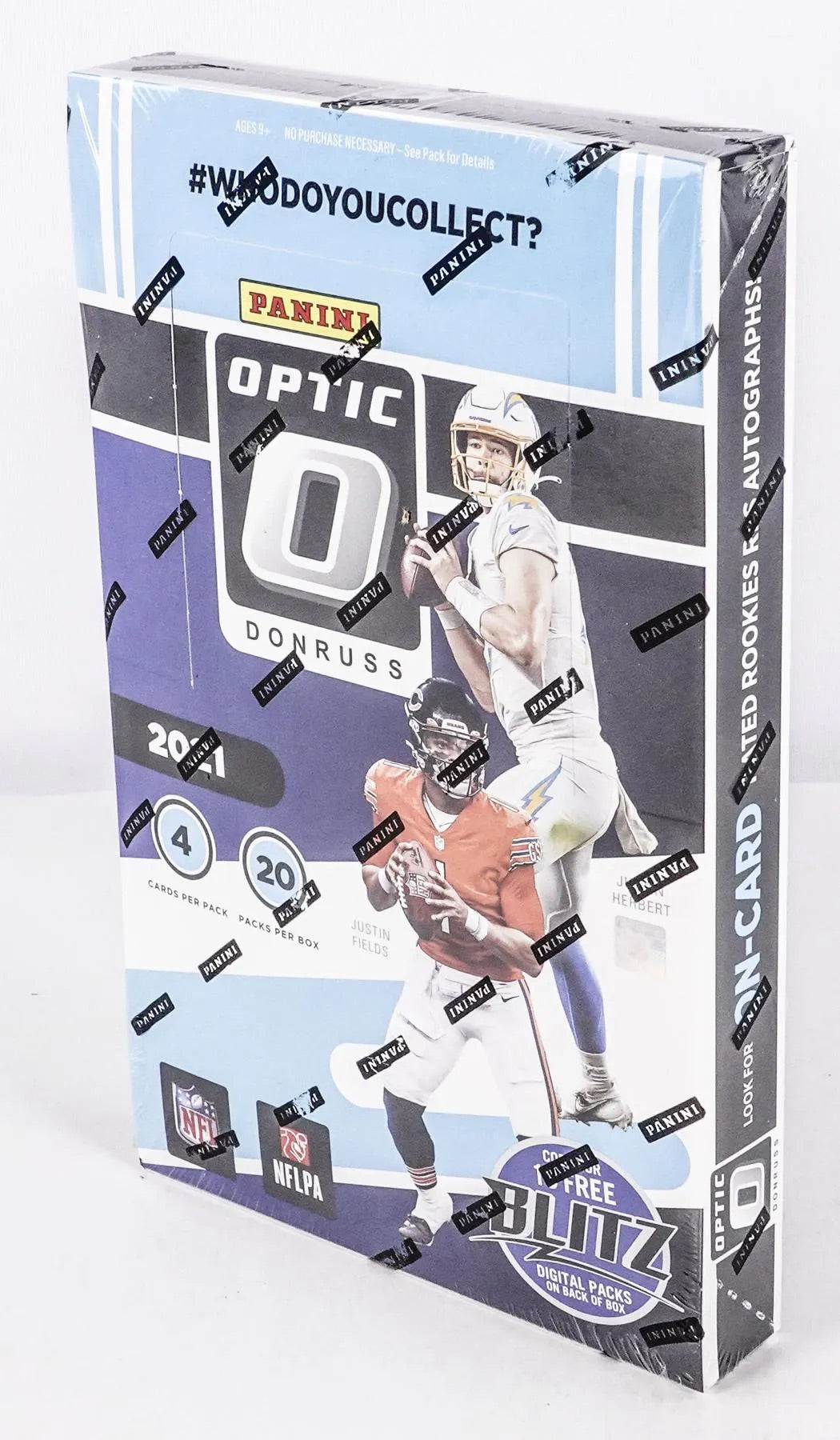 One of the most anticipated releases of the year 2021 Donruss Optic is loaded with on-card autographs, parallels, and all the best rookies the NFL has to offer. Look for the rare and ultra popular case hit insert, Downtown which parallels down to Gold Vinyl 1/1! Look for 1 autograph, 20 Rated Rookies, 10 parallels (8 numbered), and 4 inserts per box on average. 4 cards per pack. 20 packs per box.