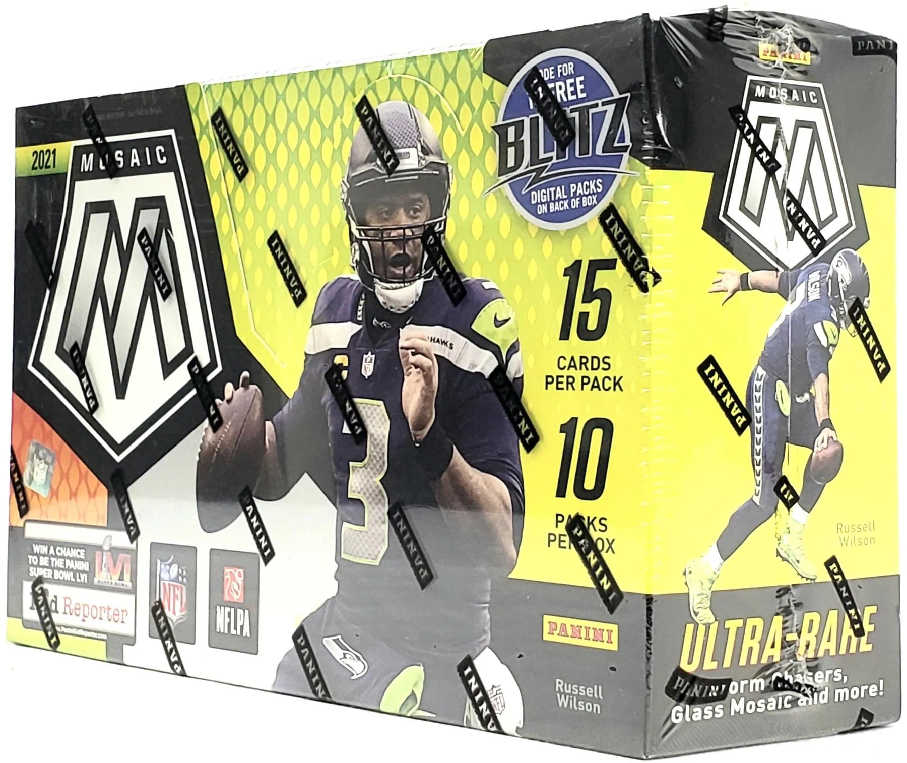 After an immensely popular debut, Mosaic Football is back in 2021. Loaded with parallels, inserts and autographs of all the best rookies, current stars and retired legends the NFL has to offer. Exclusive to Hobby Boxes find Autographs Mosaic and Rookie Autographs Mosaic. Hunt For brand new case hit inserts: Busted, Glass Mosaic, Storm Chasers, Masquerade Ballers. Hunt for SSP Gold and Black parallels! Chase all the hottest new rookies including Trevor Lawrence, Zach Wilson, DeVonta Smith and many more! Look for 2 autographs, 5 Silvers, 15 Mosaics, and 20 inserts per box on average. 15 cards per pack. 10 packs per box.