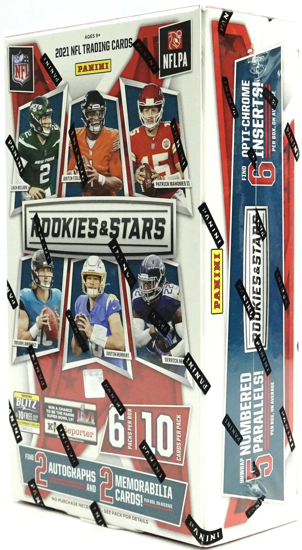 Rookies and Stars 2021! Collect the biggest and brightest stars the NFL has to offer! On average, each box of Rookies & Stars delivers two autographs & two memorabilia! Collect Crusade, one of the trading card world’s most iconic inserts! Exclusive to Hobby, collect Dress For Success, an autographed memorabilia card featuring the top players from the 2021 NFL Draft Class! Be on the hunt for short-printed Opti-Chrome autograph parallels of Crusade, Airborne, Stellar Rookies & new to 2021 Star Studded! Look for 2 autographs, 2 memorabilia cards, 5 numbered parallels, 12 inserts, 12 rookies, and 6 opti-chrome inserts per box on average. 10 cards per pack. 6 packs per box.