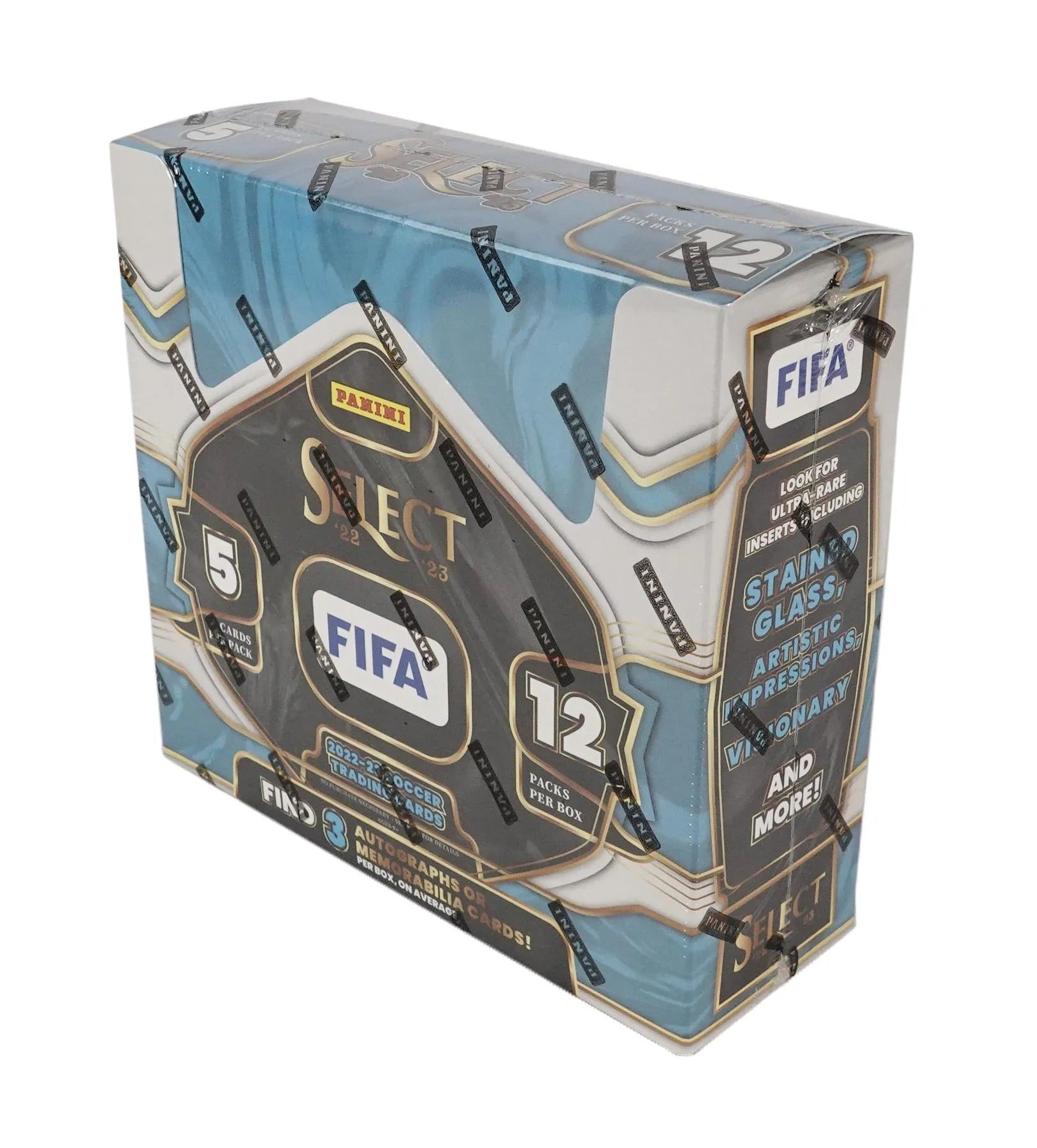 The popular Select brand returns to soccer for the 2022-23 season with a FIFA release featuring 20 national teams! Look for 3 autographs or memorabilia cards, 7 inserts or insert parallels, 9 unnumbered base parallels, and 5 numbered base parallels per box on average. 5 cards per pack. 12 packs per box.