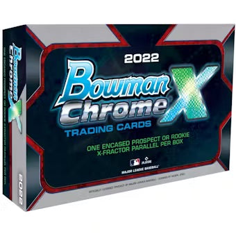 Look for RARE X-Fractor Orange, Red, or Gold parallels and super rare Autograph Variations #'d to 5! Collect the top 100 rookie and prospects from the 2022 Bowman Chrome checklist on the exclusive X-Fractor stock with 2022 Bowman Chrome X! Each box contains 1 encased X-Fractor card per box!