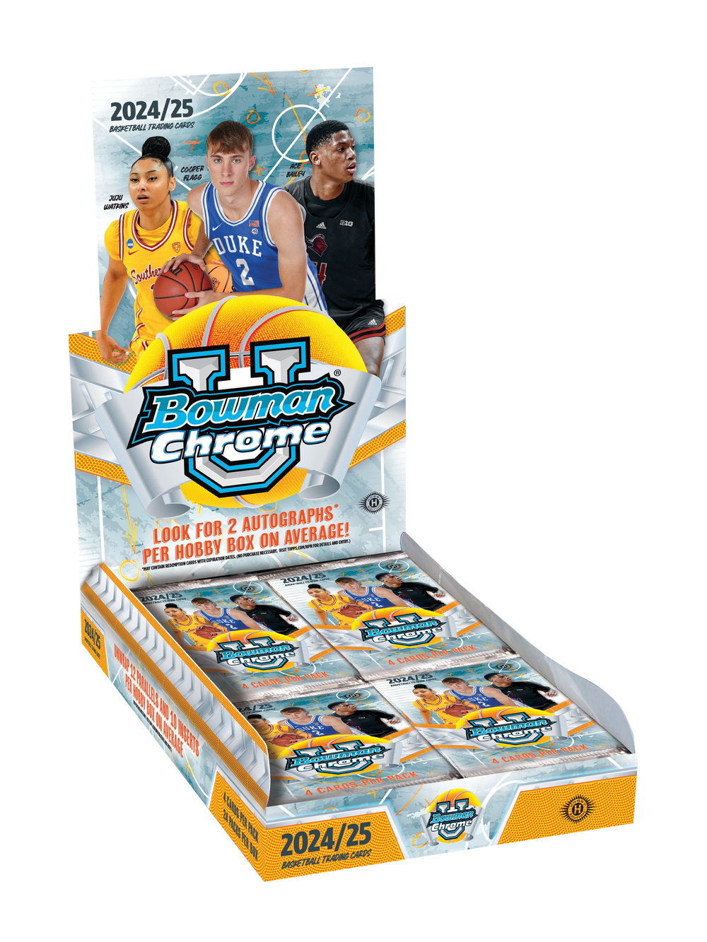 Bowman University Chrome Basketball is back for another season with an all new, full chrome release featuring licensed cards from some of colleges most prolific programs in 2024/25! Complete the 100-card Base Set featuring some of the best up and coming talent from around the world! Each Box contains Two Chrome Autographs, Ten Insert Cards, Two Refractor Parallels, and Six X-Fractor Parallels, on average! 24 packs per box, 4 cards per pack.