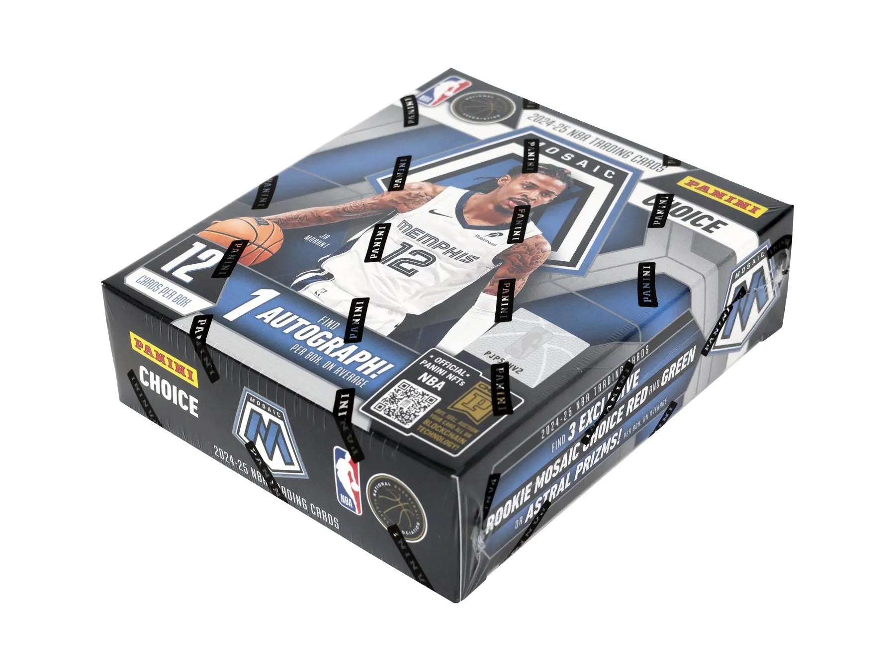 Mosaic returns with a collection of its popular parallels, autographs, and inserts! Look for 2 autographs, 18 base Prizms, and 6 inserts or insert parallels per box on average! Search for Exclusive Mosaic Choice Peacock and 1-of-1 Nebula Prizms! Collect top rookies from the 2024-25 NBA Draft Class! Find Exclusive Choice parallels! Look for 1 autograph and 3 Exclusive Rookie Mosaic Choice Red & Green or Astral Prizms per box on average. 12 cards per pack. 1 pack per box.