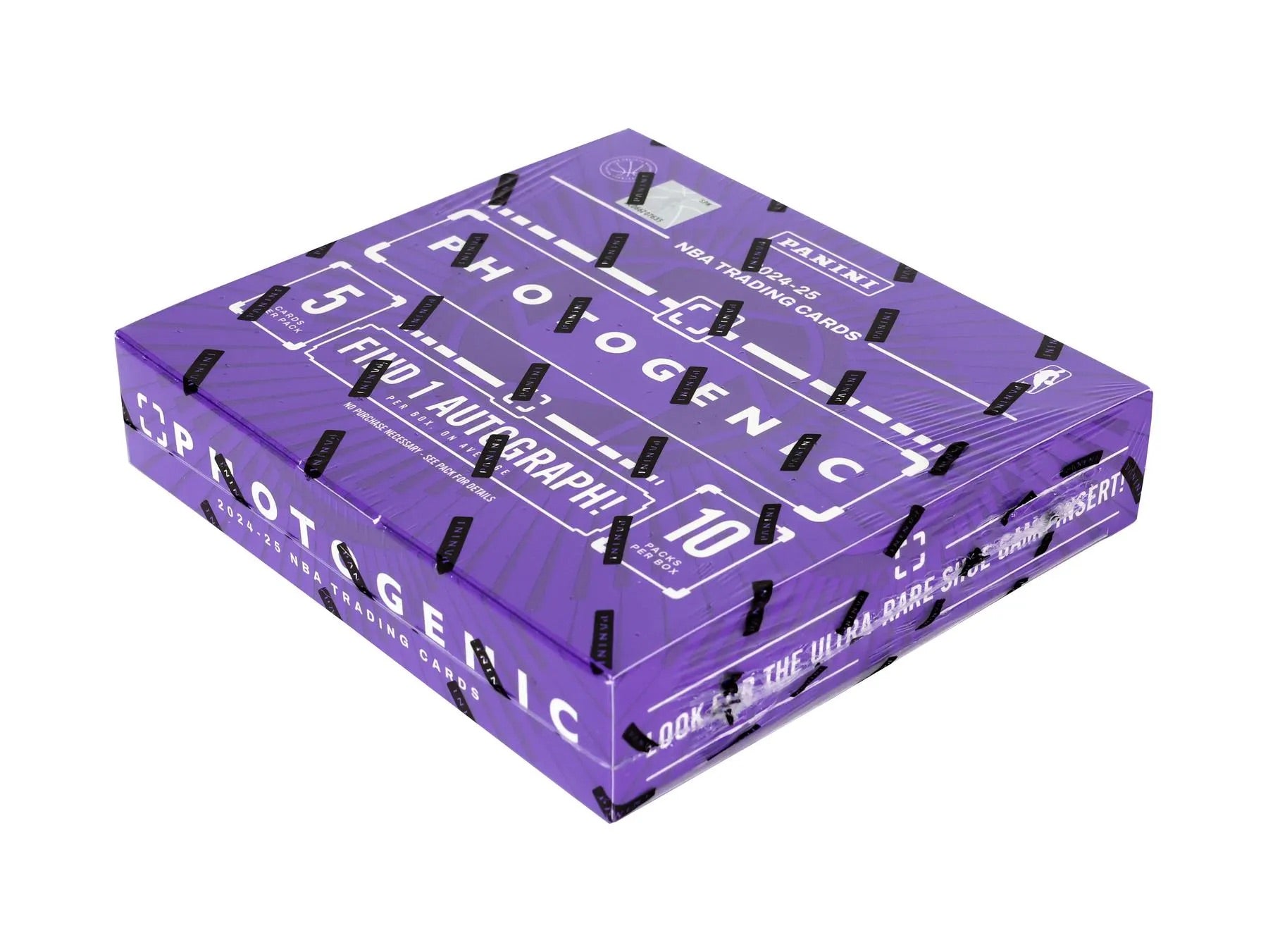 2024-25 PhotoGenic Basketball, a photo-driven program, returns for its fourth year! Collectors can expect to find the best of the best and most unique photography of the top Superstars, Legends, and Rookies in the NBA. Find 1 Autograph per box, on average, in the sets Rookie Autographs, Veteran Autographs, Burst Rate Signatures, and Dual Autographs featuring the top rookies and vets along with some of the top duos of the past and present! Also search for Picture Perfect Signatures, which is new to PhotoGenic this year! Find 4 Base Parallels per box, on average! Search for Base, Base Rookies and Base Legends parallels such as Silver (#’d/99), Diamond (#’d/75), Wedges (#’d/49), Maze (#’d/25), Gold (#’d/10), Fireworks (#’d/5), and Platinum One-of-One! Also search for all-new Base Parallels such as Stardust (#’d/65), Groovy (#’d/35), and the short-printed Lightspeed! Find 3 Inserts/Insert Parallels per box, on average, which include Unforgettable, First Night, With Authority, Rookies in Motion, Rookie Focus, Progressions and the brand new ones this year Scrapbook, Photo Finish and To the Rafters! Look for the ultra-rare The Shoe Game Die-Cut insert as well as the new SSP, Names of the Game! Look for 1 autograph, 4 Base Parallels, 3 Inserts/Insert Parallels, and 3 Rookies per box on average. 5 cards per pack. 10 packs per box.