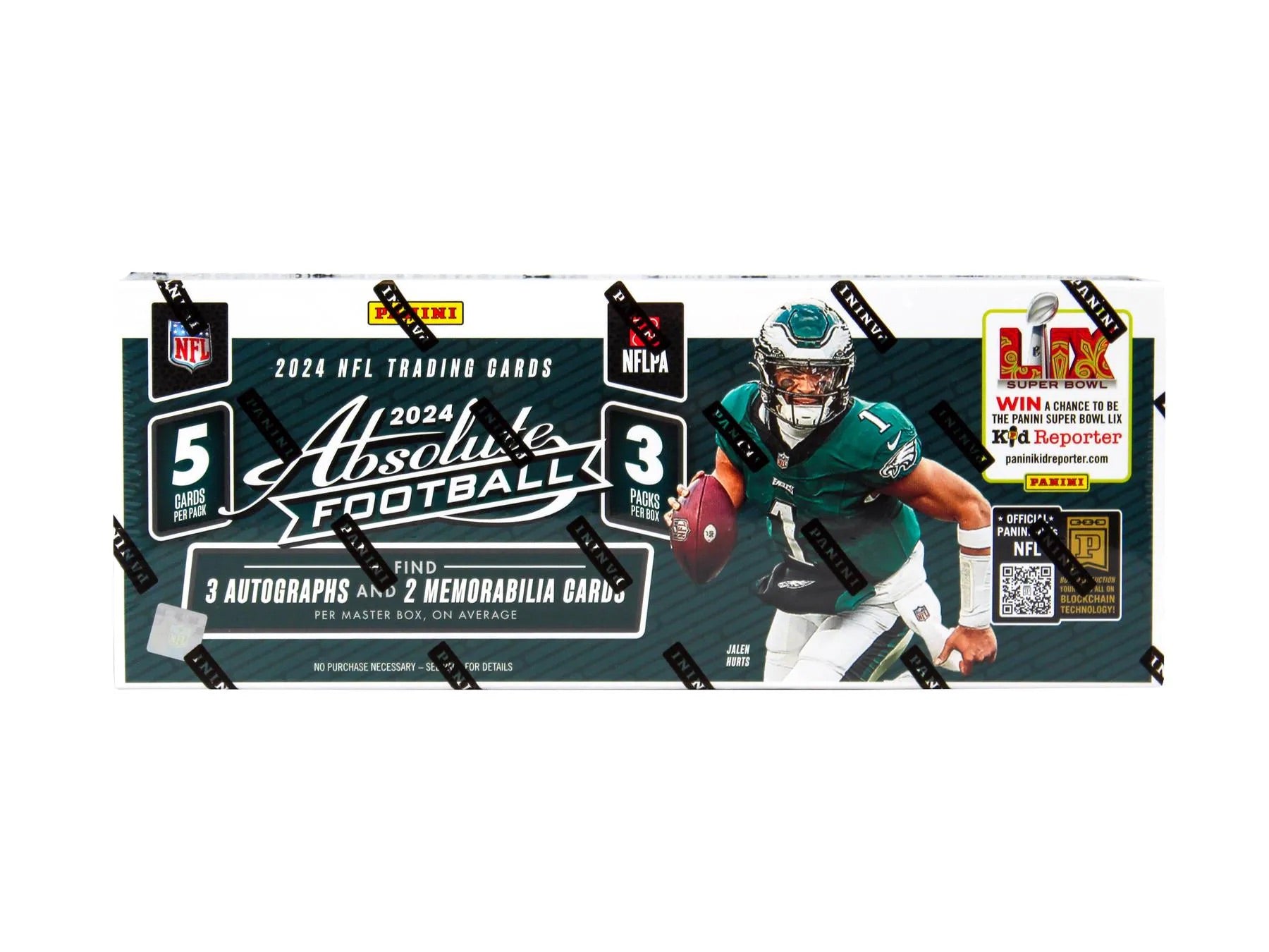 The longtime collecting juggernaut that is Absolute Football returns for the 2024 season equipped to impress with some of the most desirable autograph and autograph memorabilia cards of the early season. The product delivers a stacked checklist featuring the hottest rookies, the best veterans and the most iconic legends. Absolute's calling-card inclusions such as Rookie Premiere Materials, Tools of the Trade Materials and more return with bold new designs and star-studded checklists. Few products deliver the kind of case-chase bang that Absolute does with horizontal and vertical Kaboom! stunners and Explosive. Look for 1 Rookie Premiere Materials Autograph, 2 additional autographs, 2 memorabilia cards, 1 insert, 2 parallels, 1 rookie card, and 6 base cards per box on average. 5 cards per pack. 3 packs per box.