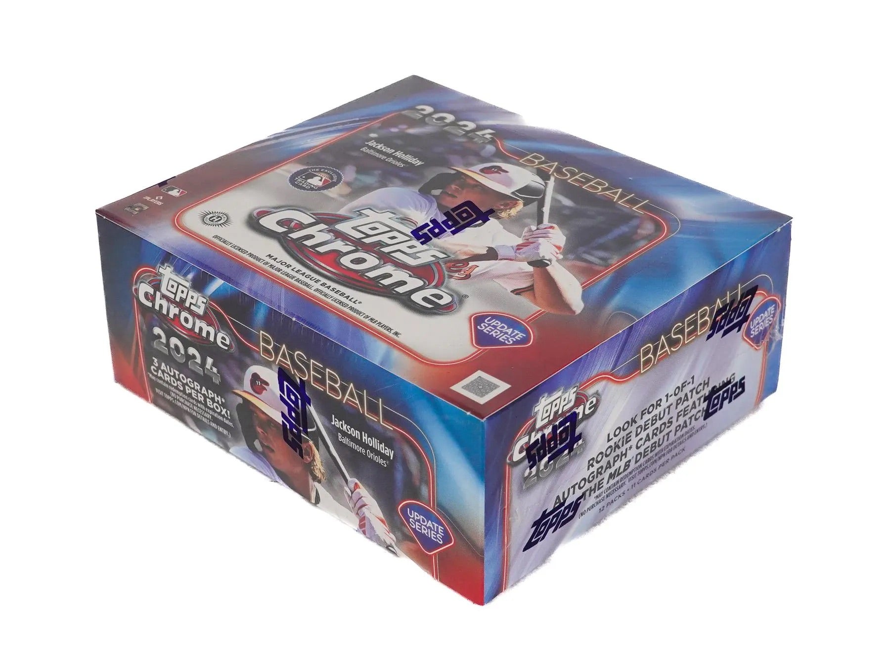 Topps Chrome Update Series Baseball returns to the diamond with more power than ever! Find all-new and returning Chrome Update Series exclusives: autograph chases for the hottest Rookies, Rookie Debut Patch Autos for 250+ Rookies PLUS Base and Chrome Autograph Lava Lamp Refractor parallels! 200 of the most compelling subjects from 2024 Topps Baseball Update Series, including recently traded players, new rookies, and Rookie Debuts all printed on Chrome! Look for 3 chrome autographs and 2 numbered parallels per box on average!11 cards per pack, 12 packs per box.