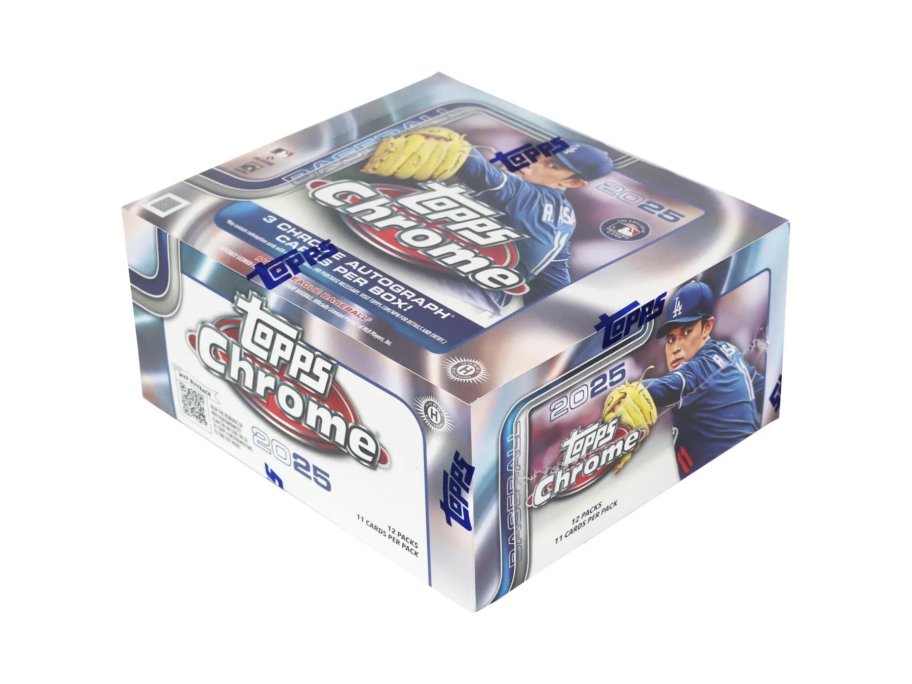 2025 Topps Chrome Baseball has it all! Chase a fun mix of jaw-dropping inserts and exciting chrome parallels, as well as on-card autos of some of the most electrifying young talent in baseball history! Build the entire 300-card Base Set across a rainbow of color and tech parallels! Look for 3 Chrome Autographs per box on average. 11 cards per pack. 12 packs per box.